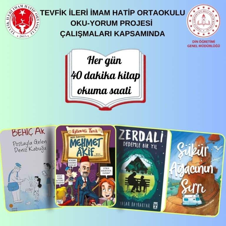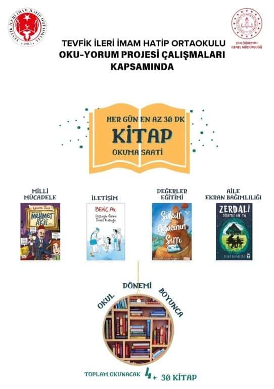 Türkiye 100 Yılı Maarif Modeline uygun olarak ve ilimizde devam eden OKU-YORUM proje çalışmaları kapsamında okulumuz İmam Hatip ruhuna uygun yeni nesil 34 kitap tespit edilerek tüm sınıflarımızın sınıf kitaplıklarına ayrı ayrı kazandırıldı. Yaklaşık 800 kitaba 180000 TL ödendi.
